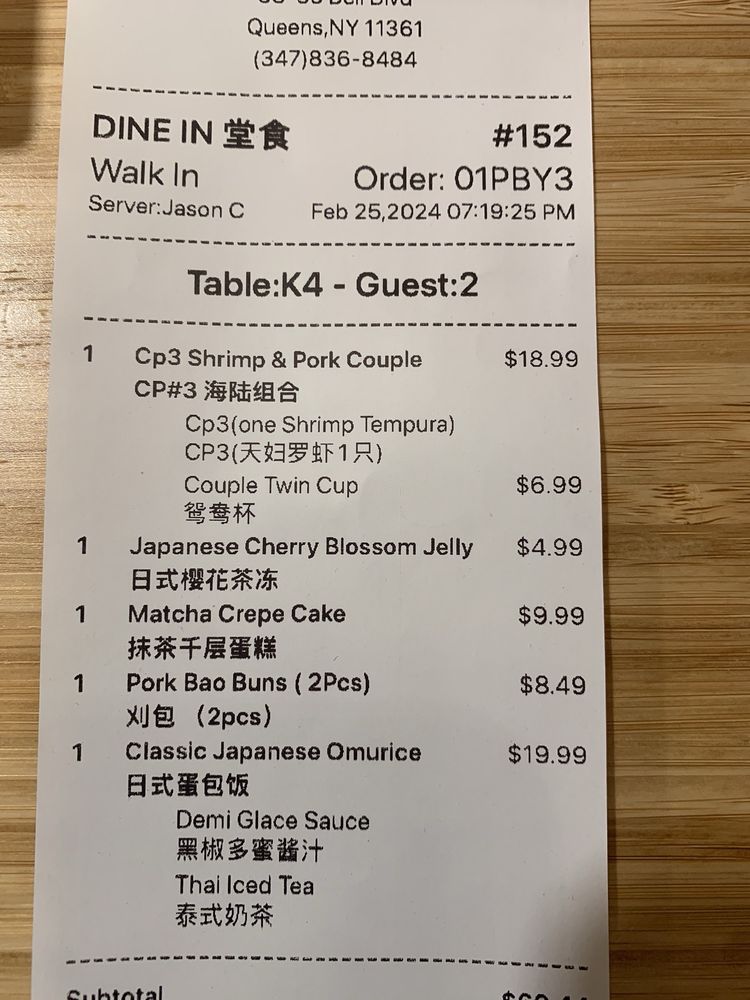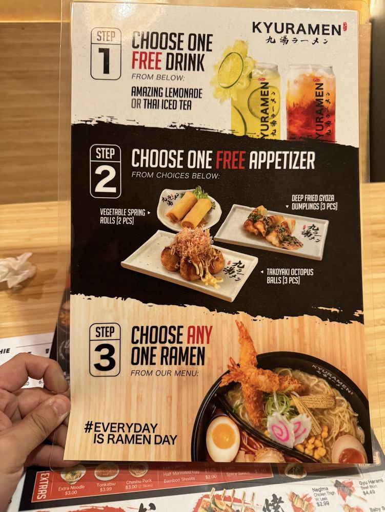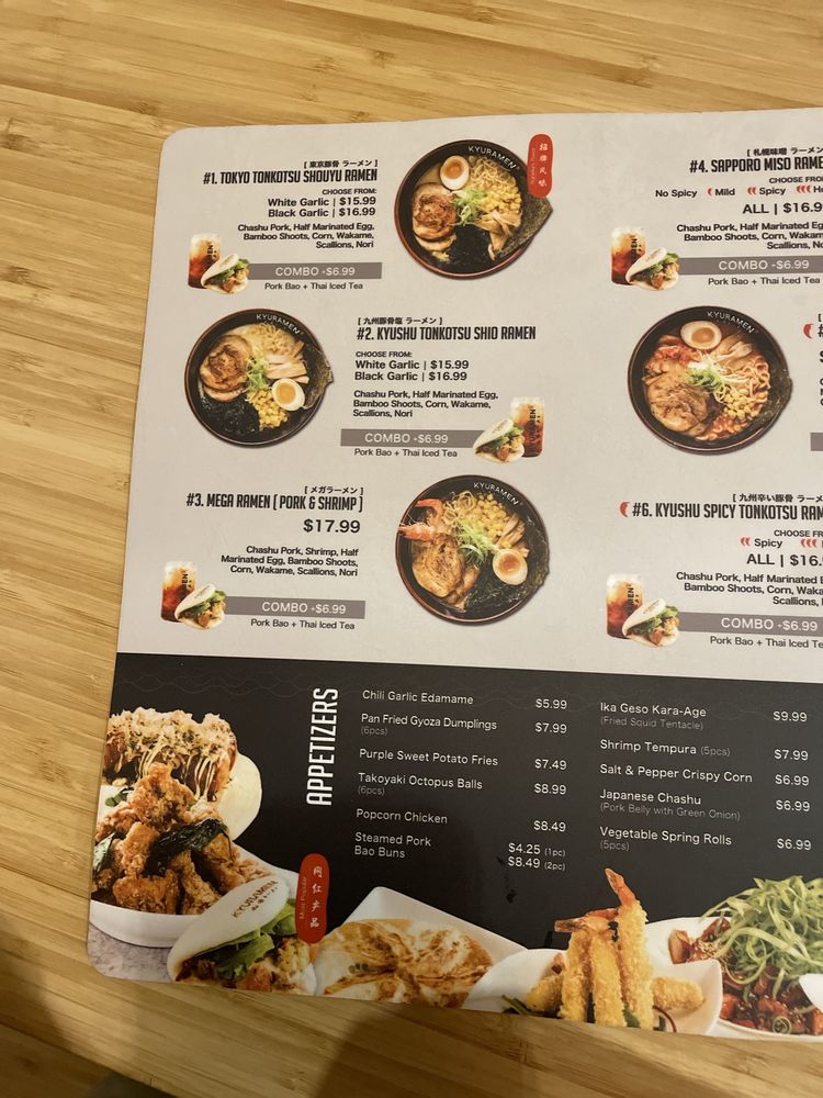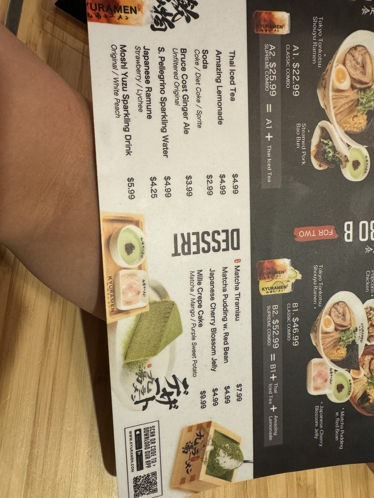 Combo includes:Tokyo Tonkotsu Shouyu Ramensapporo miso ramenpopcorn chickenjapanese cherry blossom jellymatcha pudding w. red beanThai Iced TeaAmazing Lemonade